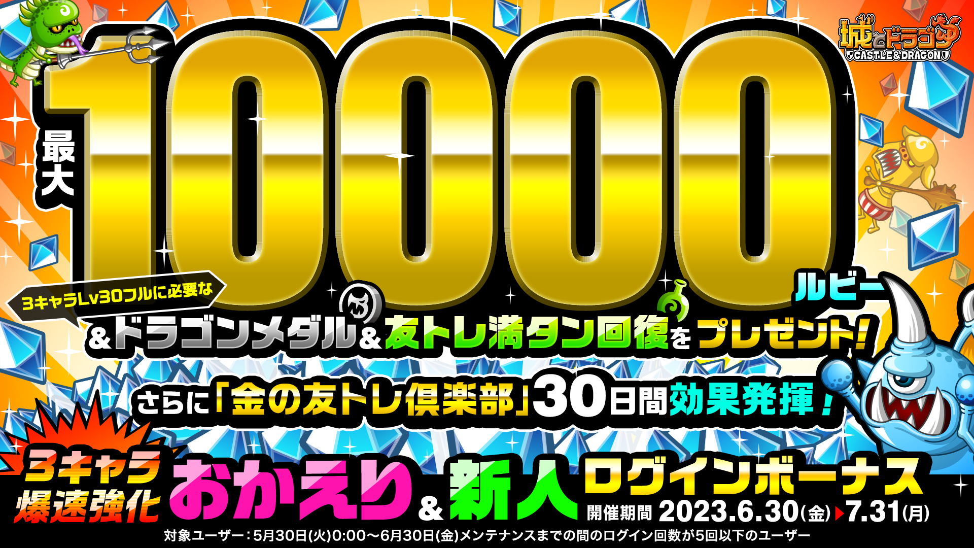 新規プレイヤーと、ひさしぶりにゲームにログインしてくれた復帰プレイヤーを対象に、好きなキャラ3体をLv30まで育成するのに必要な“ドラゴンメダル”や“友トレ満タン回復”、“CP”に加え、最大10000ルビーや「金の友トレ?楽部」30日間無料がプレゼントされます。