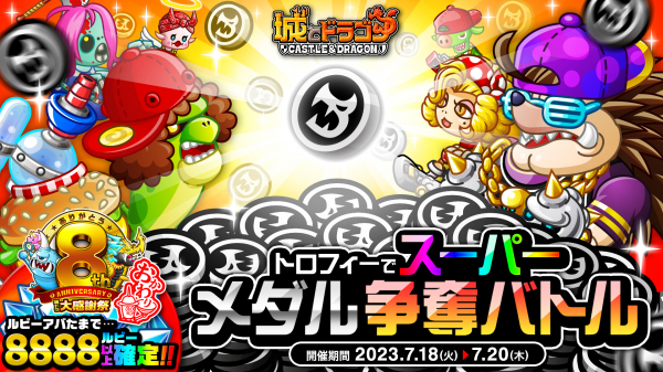 株式会社アソビズム(本社:東京都千代田区、代表取締役:大手智之)は、App Store・Google Playにて好評配信中の『城とドラゴン』で「トロフィーでスーパーメダル争奪バトル」を2023年7月18日(火)より開催いたします。