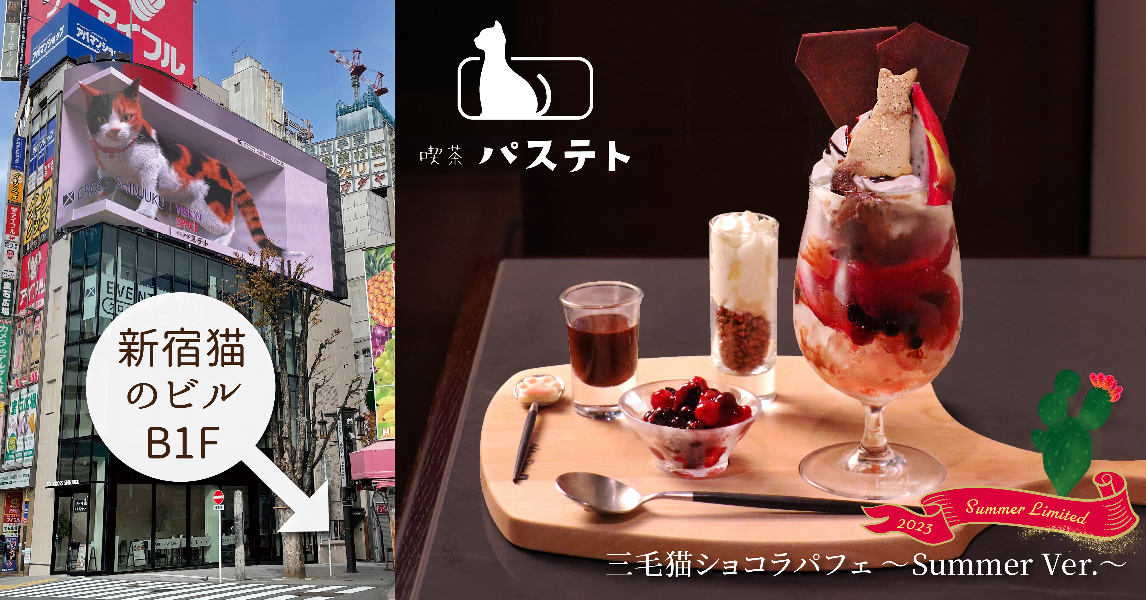株式会社アズフードシステムズ(本社:東京都中央区、代表取締役:森田威)が運営する、新宿駅東口すぐの喫茶店「喫茶 パステト」は、同店の階上に設置されたクロス新宿ビジョンの目玉コンテンツである“3D巨大猫(新宿東口の猫)”をテーマにした『三毛猫ショコラパフェ』がリニューアル。サボテンやドラゴンフルーツを使用した夏バージョン『三毛猫ショコラパフェ ~ Summer Ver. ~』として、2023年7月19日(水)より夏季限定で発売いたします。