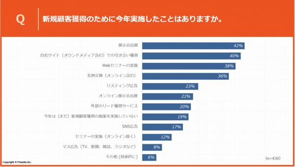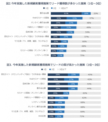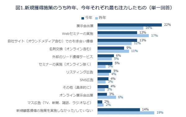 新規顧客獲得施策を実施していないという回答が前年より減少しており、今年はリード獲得により積極的に取り組んでいると思われます。