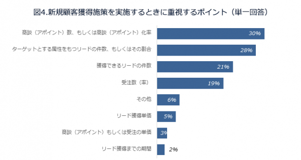 新規顧客獲得時に最も重視するポイントについては、「商談(アポイント)数、もしくは商談(アポイント)化率」「ターゲットとする属性を持つリードの件数、もしくはその割合」という質に関する回答が多く集まりました。