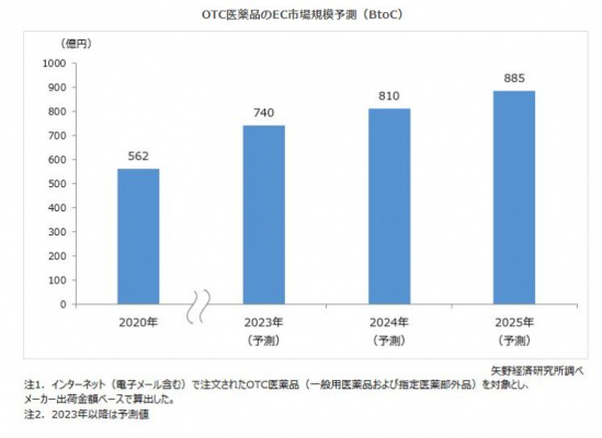 国内における、2025年のOTC医薬品(一般用医薬品および指定医薬部外品)のEC市場規模(BtoC、メーカー出荷金額ベース)は885億円になると予測する。OTC医薬品のEC市場規模は、2020年から2025年までのCAGR(年平均成長率)が9.5%で成長する見通しである。国内OTC医薬品市場全体が微増から横ばい傾向で推移し、2025年も8千数百億円規模※の見込みの中で、OTC医薬品のEC市場は今後も成長する販売チャネルであると考える。