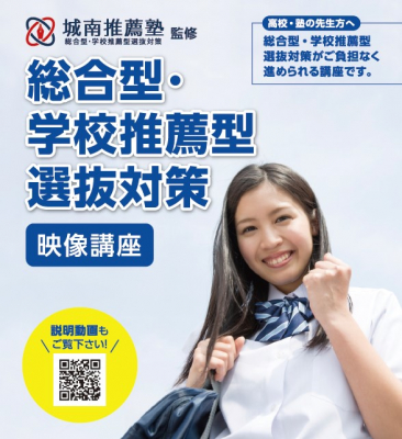 「総合型・学校推薦型選抜対策」は、総合型・学校推薦型選抜対策を先生方の負担なく進められるよう開発された、総合型・学校推薦型選抜対策の映像講座です。監修は、2015年の開校以来多くの合格実績を持つ「城南推薦塾」。ワークシートを使った全9講の映像授業で、志望理由書から面接まで、総合型・学校推薦型選抜対策が完結します。