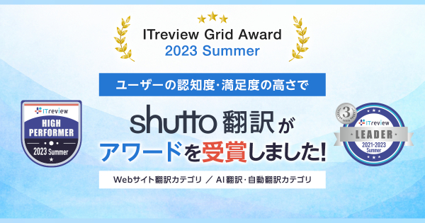 この度、Webサイト翻訳サービス「shutto翻訳」は、アイティクラウド社主催の「ITreview Grid Award 2023 Summer」において、ユーザーから高い評価を受け、Webサイト翻訳カテゴリーでアワード「Leader」を、AI翻訳・自動翻訳(テキスト翻訳)ツールカテゴリーでアワード「High Performer」を受賞しました!Webサイト翻訳カテゴリーについては、18期連続の受賞となります!