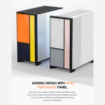 EH1 Mondrianは、オランダの抽象画家ピート・モンドリアン(1872~1944)の作品にインスピレーションを受けた独特なデザインのミドルタワーPCケースです。つやありとつや消し2種類の強化ガラスをフロントパネルに搭載し、ブラックモデルは鮮やかなオレンジ・イエローとネイビーの対比を、ホワイトモデルはホワイト・ピンク・グレーの調和した色合いを楽しめます。左サイドには強化ガラスパネル、右サイドにはデザインと冷却性を兼ね備えた通気孔を搭載し、最大435 mmのグラフィックスカード、最大180 mmのCPUクーラーに対応するほかトップとフロントに最大360 mmのラジエータ搭載にも対応することで美観と性能を両立したシステムを構築できます。