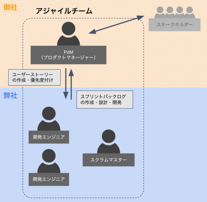お客様内のプロダクトマネージャー(PdM)と弊社開発メンバーでアジャイルチームを構成し、お客様内の内製チームのように一体となることで、共創によるプロダクト価値の最大化に貢献いたします。