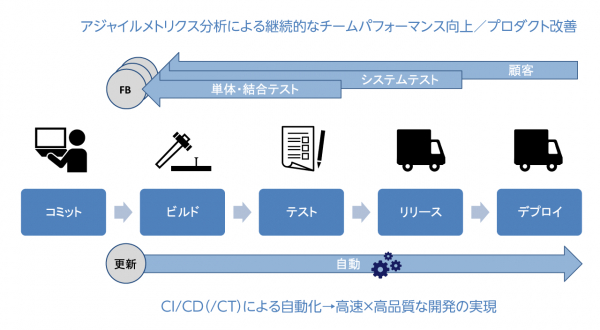 本サービスでは、アプリケーションの開発時から運用における、様々なメトリクスを収集し、継続的にチームパフォーマンスを向上させます。また、各種メトリクスとビジネス目標とをリンクさせつつ改善活動をおこない、ビジネス目標の達成につながるチームパフォーマンスの改善を重点的に実施していくことで、お客様のビジネスに貢献することができます。