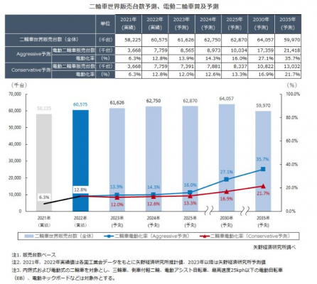株式会社矢野経済研究所(代表取締役社長:水越孝)は、二輪車の世界市場の調査を実施し、主要国の市場概況、主要メーカー動向を明らかにした。ここでは、2030年までの二輪車世界販売台数、二輪車の電動化率予測について公表する。