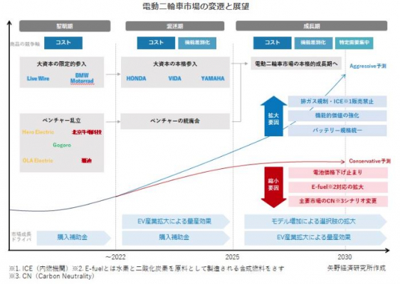 一方、電動二輪車市場はインドや中国、ASEANで堅調な推移をみせており、価格重視のユーザーが多い地域においてペネトレーションプライシング(市場浸透を目的に安価な販売価格に設定する戦略)で地場のベンチャー企業が市場での優位性を獲得している。2022年から2023年にかけて大手二輪車メーカーが電動モデルの本格的な投入をはじめており、電動二輪車市場は成長期の兆しを迎える段階にある。