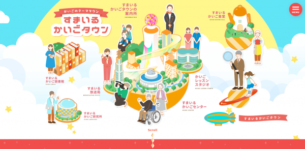「介護の街」をモチーフとした『すまいるかいごタウン』には7つの施設があり、各施設の案内人として、市長や住民が登場します。この街を訪れた少女と案内人たちの対話形式で、介護に関するさまざまな知識を楽しく分かりやすく学ぶことができる、親しみやすいサイトとなっています。