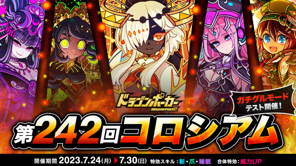 株式会社アソビズム(本社:東京都千代田区、代表取締役:大手智之)は、App Store・Google Playにて好評配信中のリアルタイム合体カードバトル『ドラゴンポーカー』で、2023年7月24日(月)より「第242回コロシアム本戦」を開催いたします。