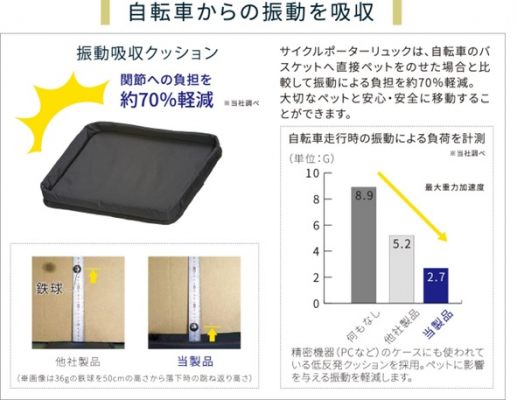 自転車バスケットにしっかりとホールドできる3箇所の固定ベルトで、転倒時もリュックの飛び出しを防止します。底面には振動吸収クッションを採用し、直接乗せた場合と比較し振動による負担を約70%軽減します。2箇所のメッシュウィンドウで通気性を確保し、暑い日用に保冷剤入れを装備、雨の日にも安心な撥水加工を施しています。リュックとしても快適に使用できるよう、軽量化と使いやすさの両立にこだわり、また様子が見えて安心な前抱っこにも配慮した仕様です。自立設計なので、普段から簡易ハウスとして使用することで、お出かけの際もスムーズに出発が可能になり、災害時なども慣れた環境で安心できます。
