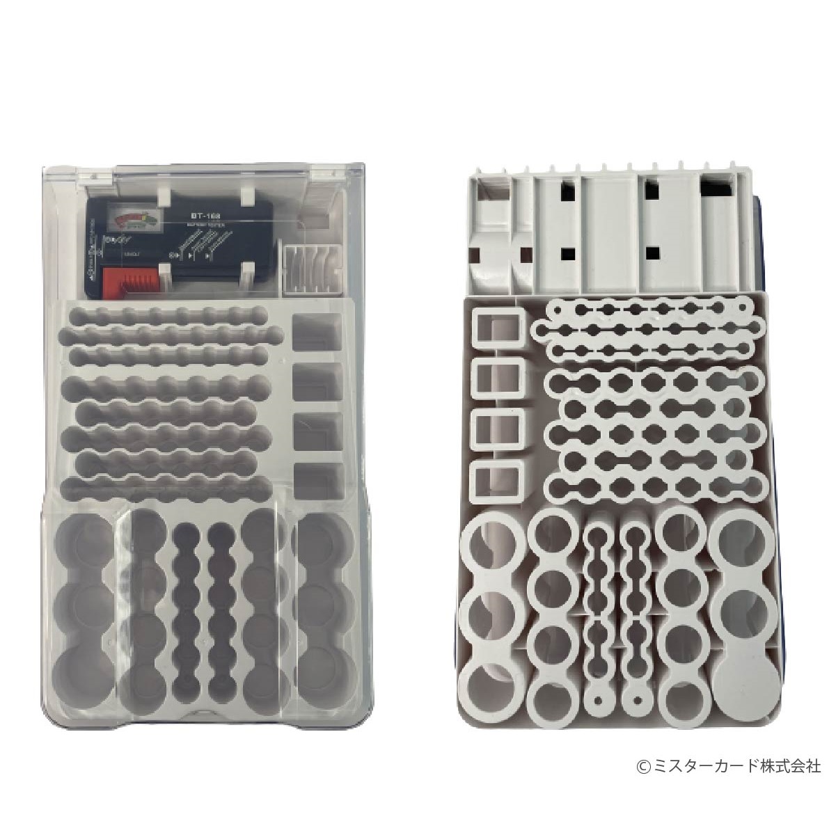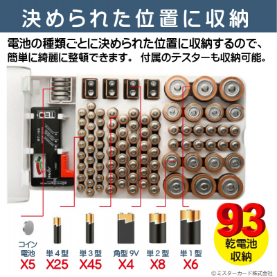 ミスターカード株式会社(本社所在地:埼玉県川口市)は、防災・緊急時にとっても便利な電池残量テスター付き乾電池収納ボックス「バッテリーマスター93」を2023年7月25日(火)から発売いたします。雑に乾電池を保管してしまうとプラスとマイナスが重なってショートしてしまう可能性もあり、乾電池の保管には注意が必要です。単1型/2型/3型/4型/角型/コイン型の6種類合計93個の乾電池を1個単位で保管できます。自然放電対策のカバーは透明で中身が一目瞭然で素早く確認できます。地震などの災害時に必ず必要な懐中電灯やラジオ、仕事で使うワイヤレスマウス、ご家庭のリモコンやガスレンジ、寒い時期には石油ストーブなどまだまだ乾電池を使う場面はたくさんあります。電池残量がわかるテスター付きなので、電池交換時期も早めに気づくことができる便利なバッテリーマスター93をご家庭やオフィスに1ついかがでしょう。