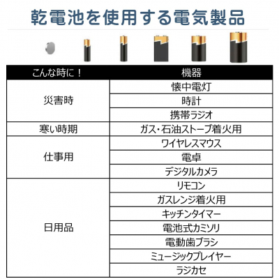 【電池が必要な機器】ワイヤレスマウス、リモコン、懐中電灯、時計、携帯ラジオ、電卓、デジタルカメラ、ガスレンジ着火用、キッチンタイマー、電池カミソリ、電灯ハブラシ、ミュージックプレイヤー、石油ストーブ着火用など。