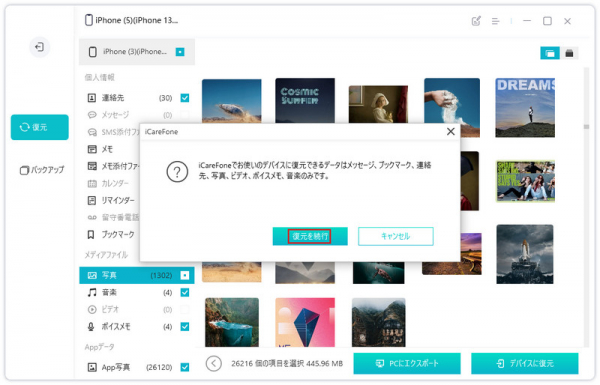 step1:iCareFoneを起動し、新しいiPhoneをパソコンに接続します。「バックアップと復元」を選択して、先に作成したバックアップを選択して、「開く」を選択します。データをプレビューして確認したら、すべてのバックアップを選択するか、必要なデータのみを選択して、右下にあるボタン「デバイスに復元」をクリックします。