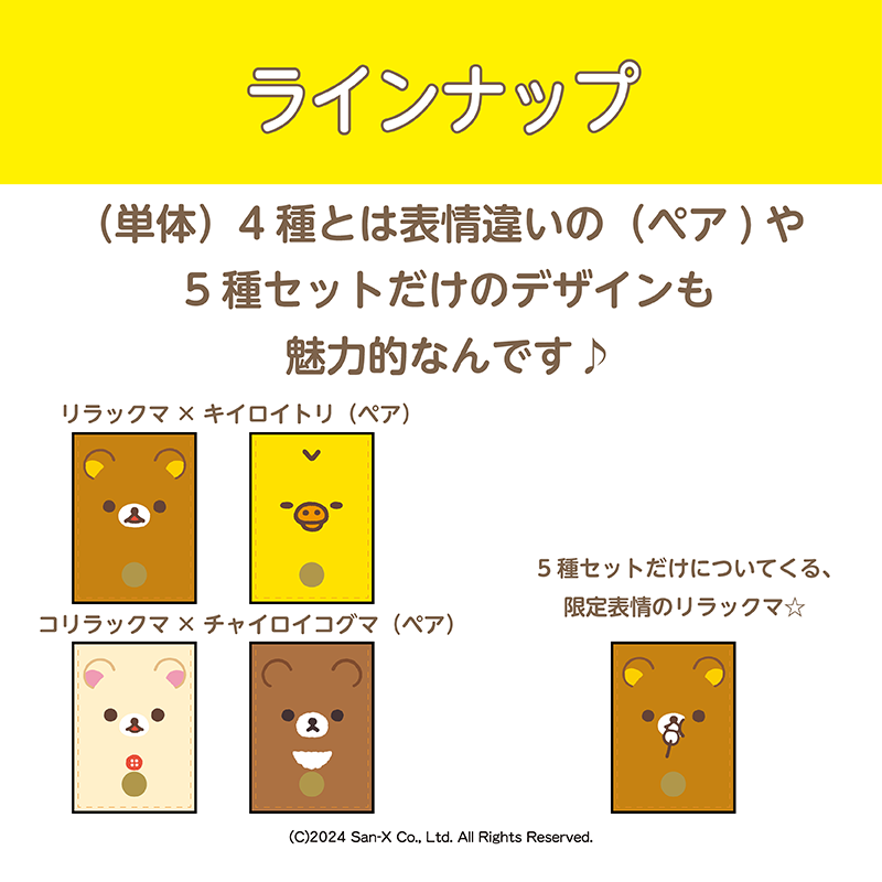 単体:リラックマ、コリラックマ、キイロイトリ、チャイロイコグマ(単体、ペア、5種セットで表情や背部デザインが異なります)