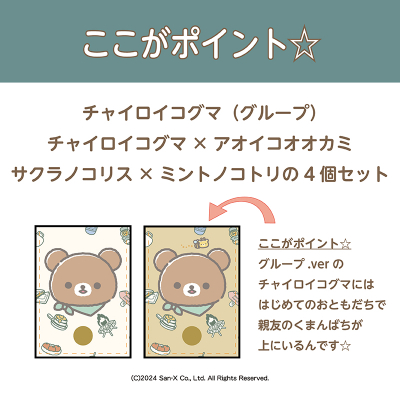 単体:リラックマ、コリラックマ、キイロイトリ、チャイロイコグマ、アオイコオオカミ、サクラノコリス、ミントノコトリ(単体、セットで表情や背部デザインが異なります)