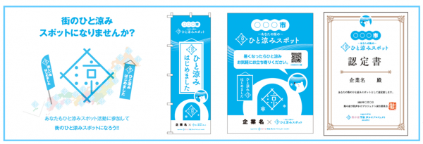 参加した民間企業には、~あなたの街の~”ひと涼みスポット”として認定証を本プロジェクトからデータで贈呈し、同時に様々なオリジナル啓発ツールデータを企業単位で作成し提供する事で啓発活動のサポートをさせて頂きます。また、参加した自治体にも、オリジナル啓発グッズなどのデータを無料で提供いたします。これにより、街の住民は、統一されたロゴなどを見て、暑いと思った際には民間や自治体のひと涼みスポットでひと涼みする事ができるようになり官民一体となって熱中症対策を推進できるようになります。(民間企業は有料/自治体は無料)