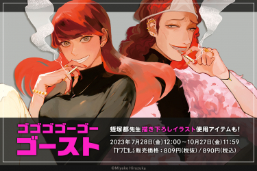 傷心ダメOLの「明智ウシロ」。彼女の前に突然現れた、オネエゴースト・正子の2人が繰り広げる、奇妙でイケイケな祟り生活!無料WEBコミック誌「COMIC BRIDGE」にて連載されていた「ゴゴゴゴーゴーゴースト」が「カワセルくじ」限定の描き下ろしイラストで登場!限定の描き下ろしイラストはS賞B2タペストリーとB賞ハンカチタオルに使用しております。