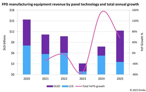 ロンドン, 2023年7月28日 /PRNewswire/ -- 2017年に約210億米ドルの収益を上げた後、OLEDとLCDパネルの製造に使用される資本的設備市場は、フラットパネルディスプレイ(FPD)産業の成熟化に伴い、年々の減少が続いてきました。この傾向は2023年にピークを迎え、FPD設備の収益は71%減の31億米ドルという過去最低水準にまで低下する見込みです。しかし、オムディア(Omdia)が2023年7月14日に発表した「OLEDおよびLCDの需給と設備トラッカー」 によれば、市場は2024年に153%の成長を遂げ、78億米ドルに回復する見込みです。