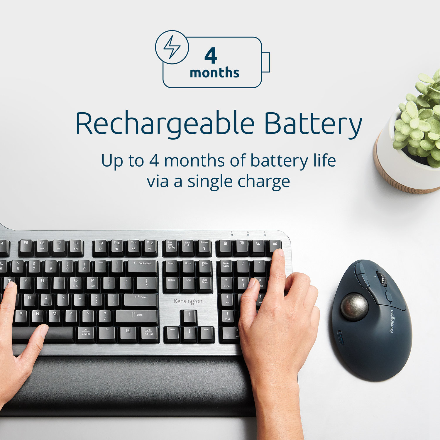 TB550トラックボールは充電可能なリチウムイオン電池搭載。1回の充電で最大およそ4カ月使用することができます。