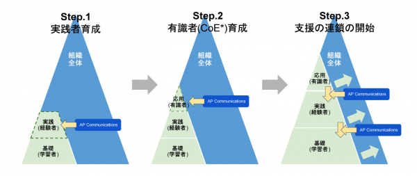 組織文化・開発プロセスの変革は、テクニカルな内容とは異なり時間もかかり成果が見えづらいです。DevOpsを会社全体で取り組めている組織が大事にしていることは、まずは小さなチームや組織単位でいいので、意識変革を取り入れ成果を出すことです。例え小さな成功体験でも、増えていくことによって徐々に賛同する有識者(CoE)が増え、組織全体へ波及できる大きな波が生まれます。
