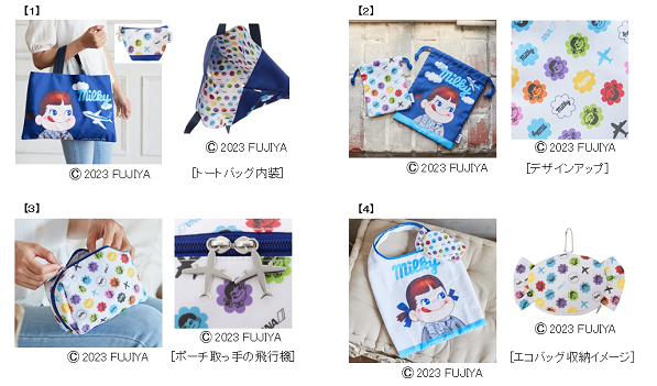 不二家とA-styleのコラボは、今年4月にMEDICOM TOY社の人気アイテム「BE@RBRICK(ベアブリック)」とのトリプルコラボ商品から始まりました。不二家とのコラボ第2弾では、日常使いから旅先など様々なシーンで使えるアイテムを企画し、トートバッグ&ミニポーチ、巾着2枚セット、ポーチ、パッカブルエコバッグを開発しました。