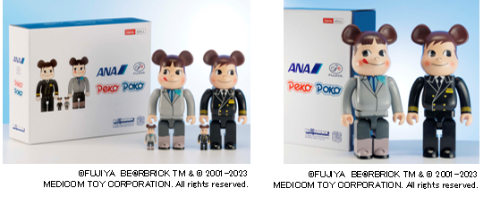 不二家とMEDICOM TOY社の人気アイテム「BE@RBRICK(ベアブリック)」とのトリプルコラボ商品も好評発売中です。ペコちゃんはCAに、ポコちゃんはパイロットになったANA限定デザインで、オリジナルのパッケージに入れてお届けします。