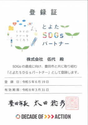 不動産業などを展開する株式会社伍代(本社:愛知県豊田市、代表取締役:鈴木丈章、以下:伍代)は、愛知県内でSDGs(持続可能な開発目標)達成に向けた取り組みを実施している企業・団体等を登録する「愛知県SDGs登録制度」に2023年7月18日(火)付で登録されました。