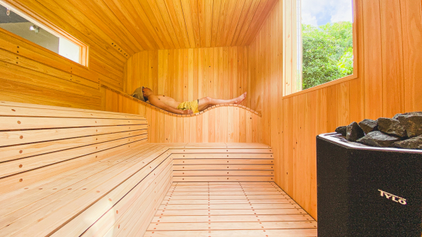 当施設のサウナ室は、6人まで入ることができます。サウナ室内では、セルフロウリューを楽しみながら、自分たちだけの空間を創造することができます。また、サウナ室の一部には大きなガラス張りがあり、日中は広大な緑を、夜には見ながらサウナを体験することが可能です。(※当日の天候による)