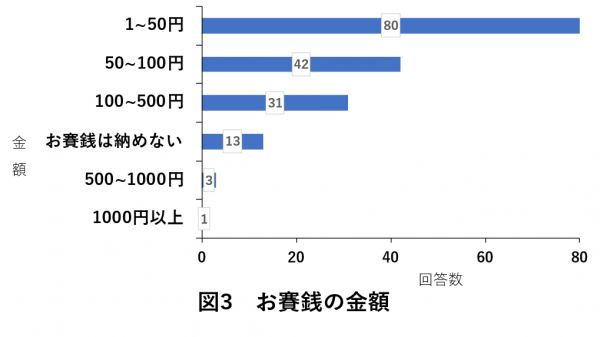 お賽銭の金額についての調査では、「1~50円」を納める人が最も多いということが分かりました。