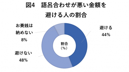 語呂合わせが悪い金額を避けるかどうかについて調査したところ、「避けない」48%、「避ける」44%、「お賽銭は納めない」8%という結果になりました。