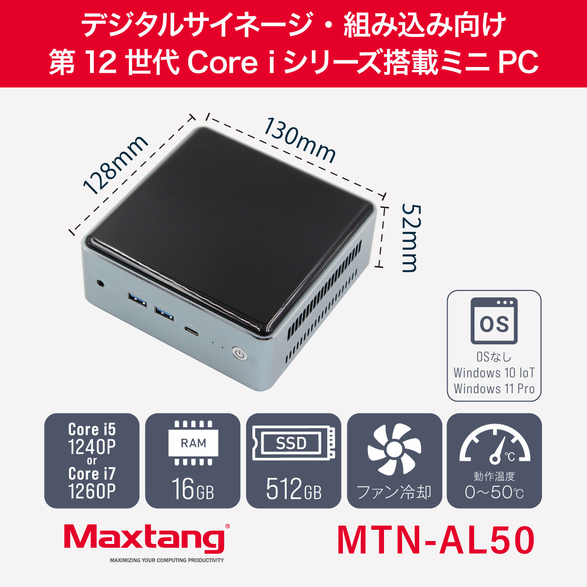 Maxtang MTN-AL50は、12コア/16スレッドの高性能なIntel(R)第12世代 Core(TM) iシリーズCPUを搭載したミニPCです。わずか130 mm四方の超小型筐体にHDMI 2.0を2ポート、USB-Cを1ポート搭載し、最大で4K@60 Hz表示とトリプルディスプレイに対応します。0 ℃から50 ℃までの過酷な温度環境でも動作し、Windows 10 IoTやWindows 11 Proを初期搭載するモデルに加え、OSレスモデルもラインアップ。デジタルサイネージや組み込みなど法人用途に最適です。