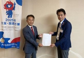 連携協定締結の様子。西淀川区の中島政人区長(右)と、当社学校教育ソリューション事業部部長の水野雅恭