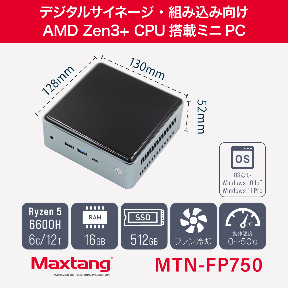 Maxtang MTN-FP750は、6コア/12スレッドの高性能なZen3+世代のCPU、AMD Ryzen(TM) 5 6600Hを搭載したミニPCです。わずか130 mm四方の超小型筐体にHDMI 2.0を2ポート、USB-Cを1ポート搭載し、最大で4K@60 Hz表示とトリプルディスプレイに対応します。0 ℃から50 ℃までの過酷な温度環境でも動作し、Windows 10 IoTやWindows 11 Proを初期搭載するモデルに加え、OSレスモデルもラインアップ。デジタルサイネージや組み込みなど法人用途に最適です。