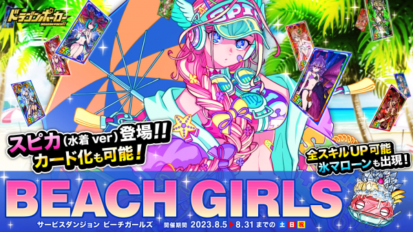 株式会社アソビズム(本社:東京都千代田区、代表取締役:大手智之)は、App Store・Google Playにて好評配信中のリアルタイム合体カードバトル『ドラゴンポーカー』で、2023年8月5日(土)よりサービスダンジョン「Beach Girls」を開催いたします。