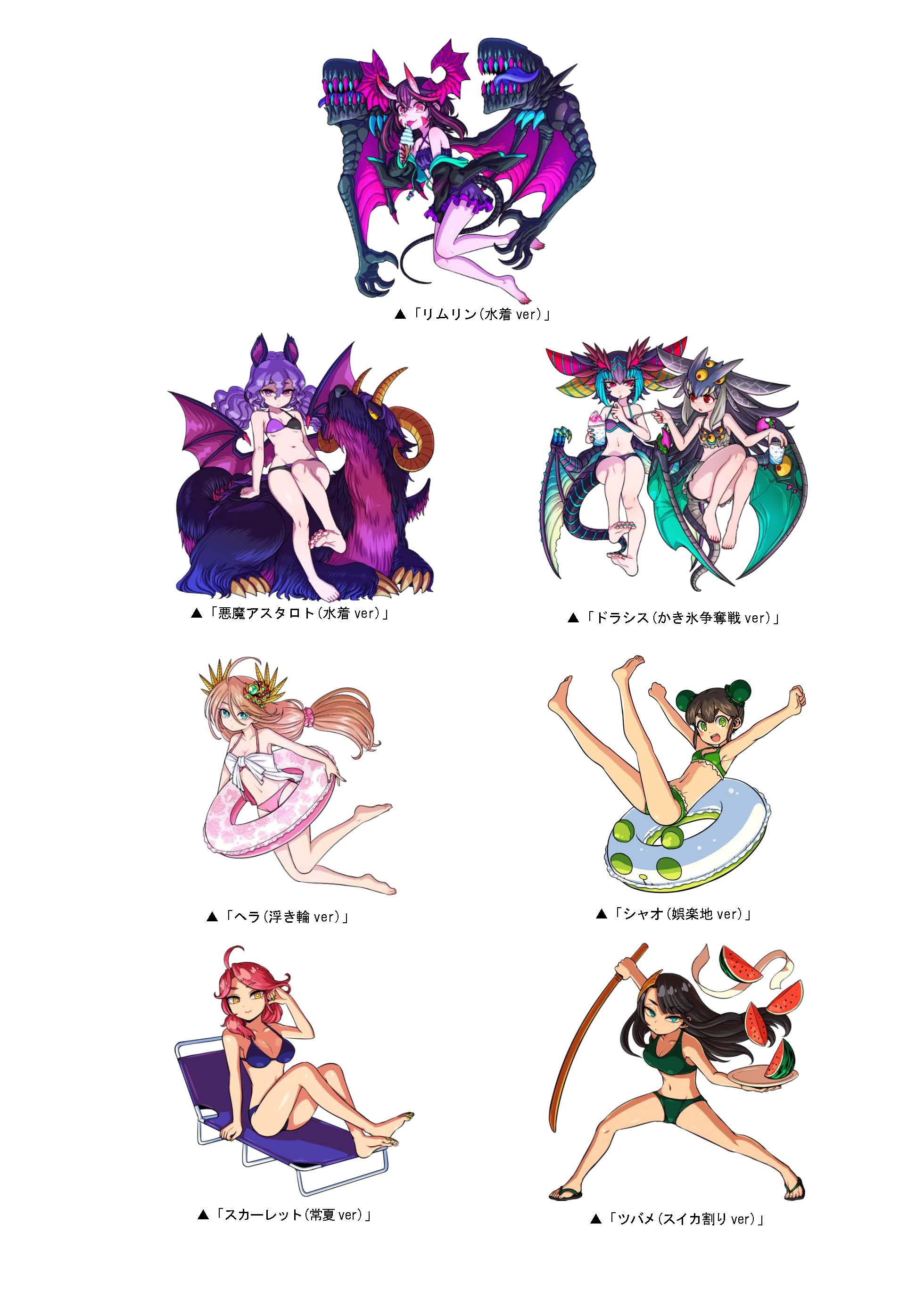 「グアム級」のボスモンスターとして「スピカ(水着ver)」が新たに登場!さらに「リムリン(水着ver)」「悪魔アスタロト(水着ver)」「ドラシス(かき氷争奪戦ver)」「ヘラ(浮き輪ver)」「シャオ(娯楽地ver)」「スカーレット(常夏ver)」「ツバメ(スイカ割りver)」などが出現することがあります。いずれもカード化が可能となっていますので、遭遇した時はカード化の成功を目指しましょう!