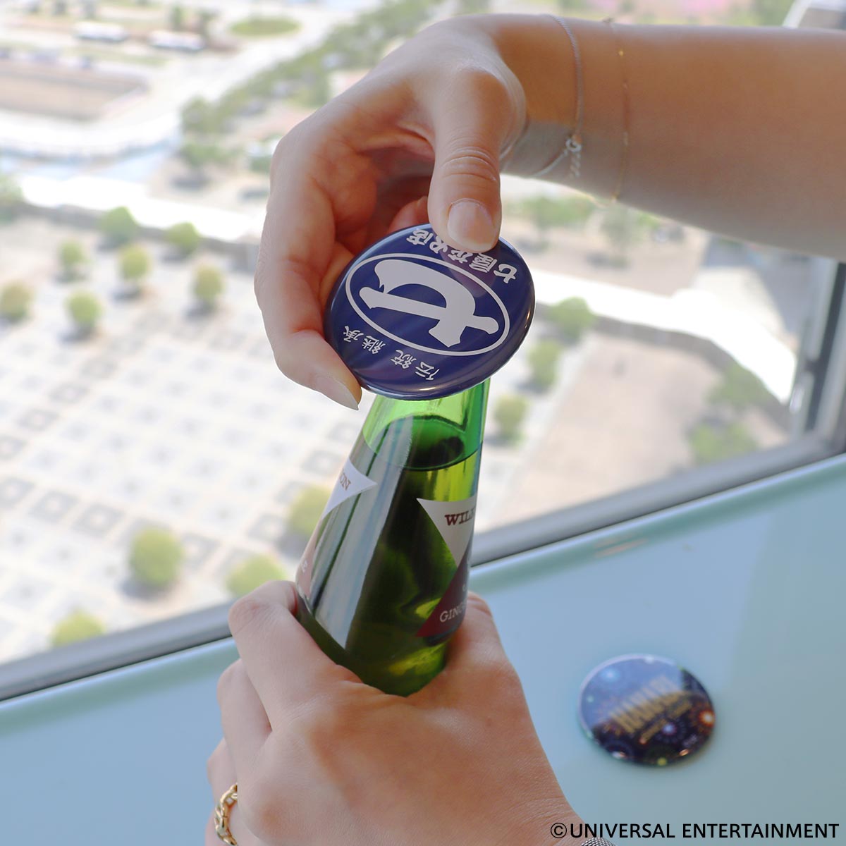 缶バッジ型のマグネットに栓抜きがついた便利グッズ。