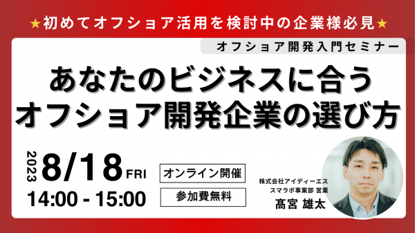 日本企業向けに特化したベトナムオフショア開発サービスを提供している「スマラボ」を運営する株式会社アイディーエス(本社:東京都港区 代表取締役:中野貴志、以下アイディーエス)は、8月18日(金)に無料ウェビナー『あなたのビジネスに合うオフショア開発企業の選び方』を開催いたします。