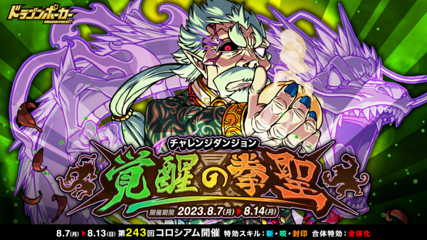 8月7日(月)より、復刻チャレンジダンジョン「覚醒の拳聖」を開催いたします。本ダンジョンでは、「拳聖チェン・シオン」がボスモンスターとして登場!フレンドと協力して強力なボスを倒し、レアアイテムを手に入れましょう!また、「第243回コロシアム本戦」も同時開催。報酬のドラゴンメダル大量獲得を目指し、手に汗握る壮絶なバトルに挑戦しましょう!