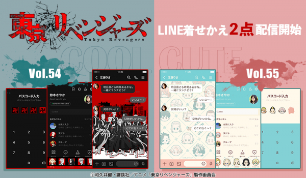 TVアニメ『東京リベンジャーズ』のLINE着せかえ最新作がインクルーズの販売アカウントより2点一斉に配信開始です!Vol.54は交通広告で話題となったイラストを使用した、シンプル且つスタイリッシュなデザイン。Vol.55はインクルーズ描き起こしミニキャラver.イラストを使用した、かわいくて使いやすいデザインです。是非、大好評配信中のLINEスタンプやLINE着せかえと合わせてTVアニメ『東京リベンジャーズ』の世界をお楽しみください。