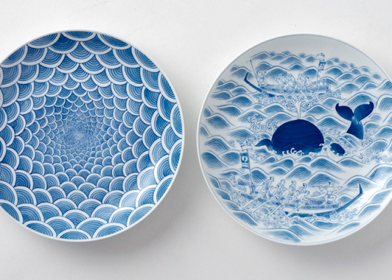 巧みな筆づかいで細い線を駆使して描いた、古典的な山水や獅子、龍。鯨の文化が溶け込む長崎の風土ならではの鯨のモチーフ。そして数十年ぶりに再現した「置き上げ」。この窯元ならではの技術が、みかわち焼の伝統を伝えると同時に、ひと目でわかる独自の器を生み出しています。
