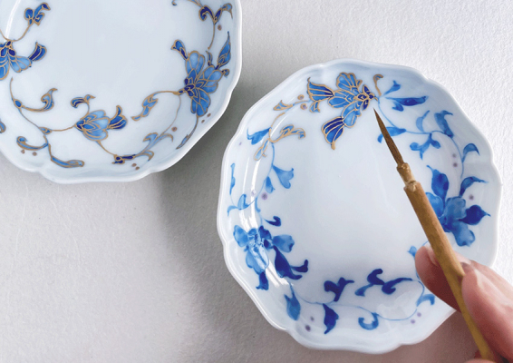 繊細優美な長崎の伝統工芸「三川内焼」。本体験会では、真っ白な白磁にあらかじめ唐草模様の青い上絵を施した豆皿に、本金を使い、お好きな箇所に自由に線を描いていただきます。