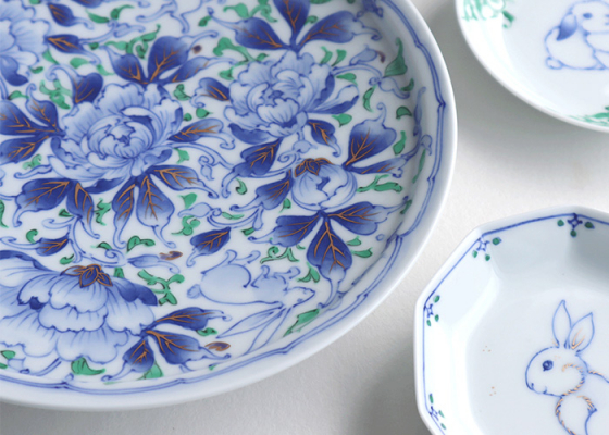 平戸藤祥五光窯で絵付けを担当している藤本江里子さんは、繊細優美な絵付け作品を制作しており、染付に淡い色絵や金彩を加えた絵柄が特徴で、金襴二度焼の色合いに青や緑のカラーバリエーションを加えて描いています。唐子絵や花鳥絵や「馬九行久」などのシリーズが人気です。