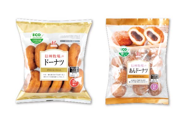 従来の巾着パッケージを廃止し、プラ包材使用量の削減とコンパクトなパッケージサイズを実現する事で、環境負荷及び輸送時の物品占有面積の低減を実現致しました。※プラ包材の使用量は従来品比で『信州牧場のドーナツ』は30%削減、『信州牧場のあんドーナツ』は25%削減としています。