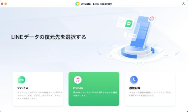 1.UltData LINE Recoveryを開き、まず「iTunes」を選択します。
