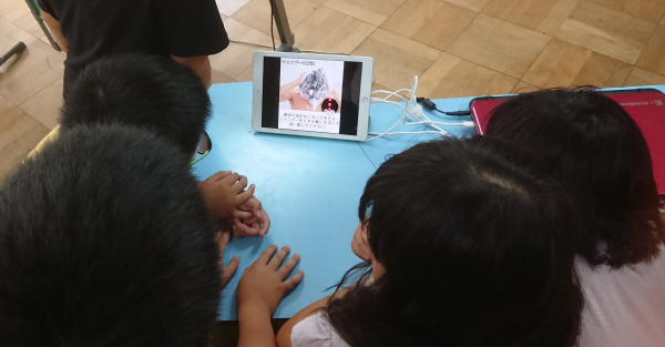 同講座の中で、マイクロスコープを用いて頭皮の状態を約200倍に拡大し、毛穴の詰まり具合や皮脂の分泌、頭皮の色などをチェックしました。ほとんど毛穴に詰まりが無かった児童は「(きちんと洗髪できていて)良かった~!」と喜んでいました。