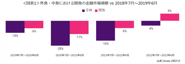 2022年7月-2023年6月計の外食・中食市場全体における間食の金額市場規模(売上)は、コロナ前の2019年7月-2019年6月比で6%増でした(図表1)。全体は、同4%減であるのに対し、間食の成長が上回っていることが分かります。