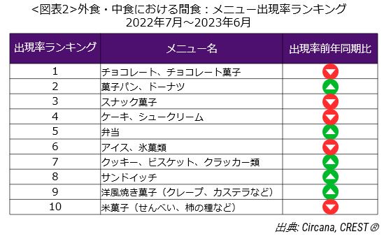 間食のフードメニュー出現率ランキングをみてみると(図表1)、1位はチョコレート、2位は菓子パン、3位はスナック菓子、4位はケーキ、5位は弁当でした。前年同期比で出現率が伸長したメニューは、出現率トップ10のうち、菓子パン、弁当、クッキー類、サンドイッチ、洋風焼き菓子でした。