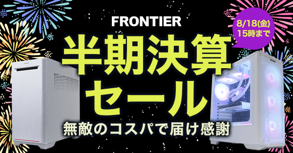 インバースネット株式会社(本社:神奈川県横浜市神奈川区新浦島町1-1-25、代表取締役社長:山本 慶次郎)(以下、当社)は、オリジナルBTOパソコンブランド「FRONTIER」の直販サイトにて、2023年8月10日(木)15時より≪半期決算セール~無敵のコスパで届け感謝~≫を開催。お楽しみ企画として一部機種・セットについては、8月12日(土)より五月雨式に販売を開始します。